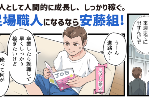 建築のあらゆるシーンで必要不可欠な「足場」の組み立て・解体工事を請け負っている安藤組様!今回は若い人向けにお仕事のやりがいを中心に「かっこよさ」を前面に出してマンガ制作致しました!
