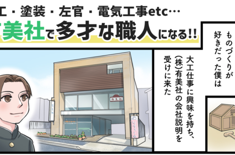 UR住宅を中心に入退去に伴う改修工事を行っている有美社様!今回は高校生向けに「多能工」として様々なスキルが身に着ける点を中心に仕事内容にも触れながらマンガ制作致しました!
