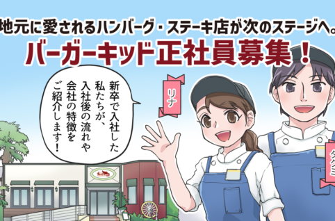 ハンバーグ屋さんを中心に飲食店を展開しているバーガーキッド様!今回は若い人に向けてインタビュー形式でマンガを制作致しました!社内の福利厚生や今後の展望などをわかりやすくまとめております。店内への張り出...